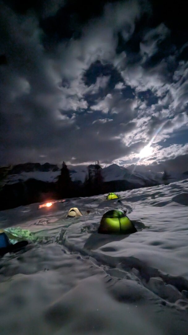 Auf unserer mini Expedition zieht jeder seine Ausrüstung auf der eigenen Pulka hinter sich her. An einem ruhigen Plätzchen über der Waldgrenze schlagen wir unser Lager auf. Am wärmenden Feuer werden wir uns verpflegen und die absolute Stille in der Natur geniessen. Die Nacht verbringen wir